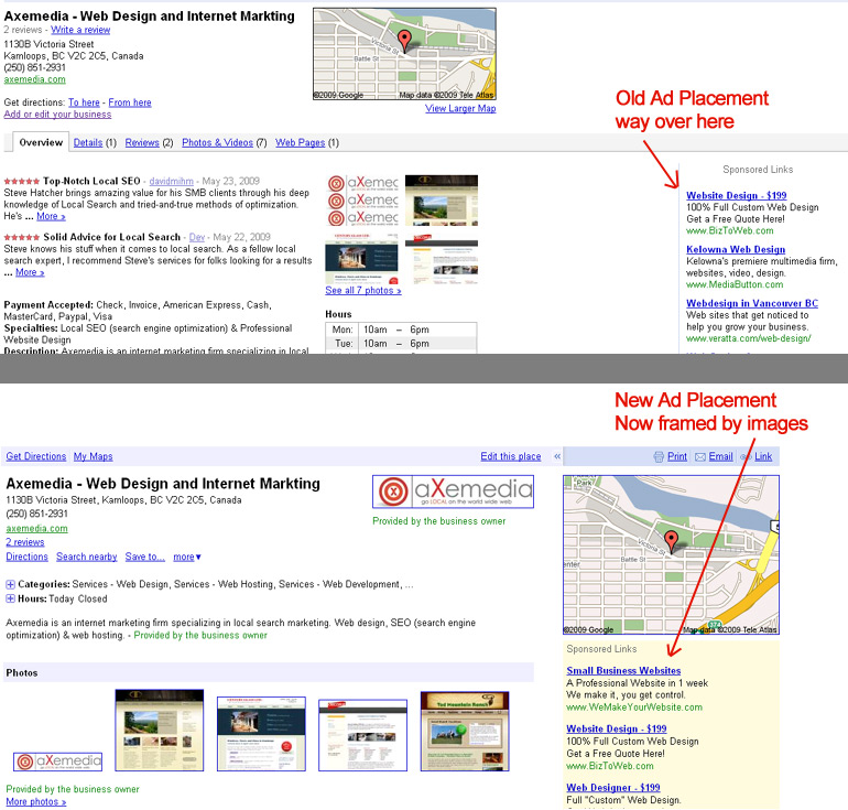 Seems to me they have also been better optimized for serving up Adwords. The local business listings had already been showing PPC ads but the new format brings them a little bit higher on the page and the new placement of the map and images makes for a better visual eyeball magnet to draw the eye to those ads. Again these ads are often for direct local competitors of the current page’s business listing, and no revenue share, of course.